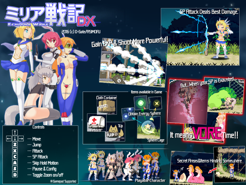 Попробовал, неплохая игра но сволочь сложная, на втором боссе долго терпел и это при лишь нормальной сложности, так же фишка прикольная что некоторые монстры поймав тебя могут тебя переделать в себя, без понятия как фишка может работать. Ну а кому лень, типо вот ECHIDNA WARS DX Save