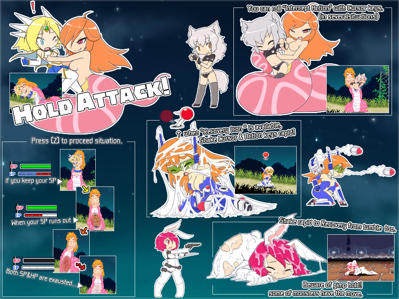 Небольшая сноска по управлению, поправте если это не так. Вырваться не получится как ни пытайся ( не думаю, что это возможно). При захвате у тебя отнимает ману и хп, она будет красной. При нажатии Z ты пропустишь текущую стадию, если у тебя не осталось маны, или скипнешь сцену если есть мана. Нажатие на X полностью скипает сцену если у тебя нет маны. (Вся красная полоска отнимается при скипе) При нажатии стрелочек туда сюда в захвате меняется анимация в некоторых сценах.